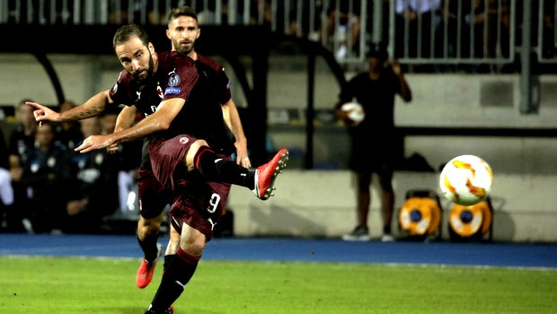 Milan's Gonzalo Higuain shoots on goal during a Group F Europa League soccer match between F91 Dudelange and AC Milan at the Josey Barthel stadium in Dudelange, Luxembourg, Thursday, Sept. 20, 2018. (AP Photo/Olivier Matthys)