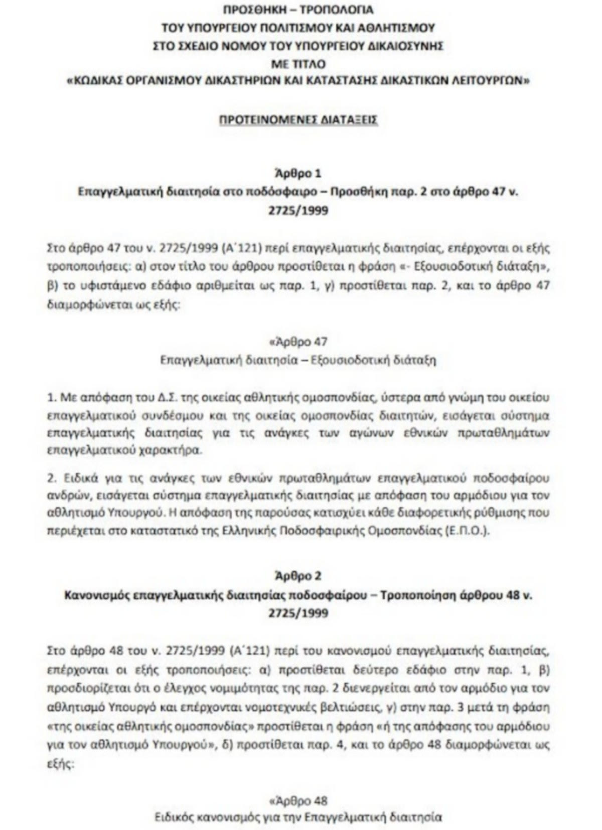 Παράλληλα τους ενημέρωσε για την κατάθεση Τροπολογίας στη Βουλή, σε σχέδιο νόμου του Υπουργείου Δικαιοσύνης (συζητείται την Τετάρτη (1/6) το πρωί στη Διαρκή Επιτροπή Δημόσιας Διοίκησης, Δημόσιας Τάξης και Δικαιοσύνης), με την οποία παρέχεται η δυνατότητα εισαγωγής συστήματος Επαγγελματικής Διαιτησίας στο ελληνικό ποδόσφαιρο.