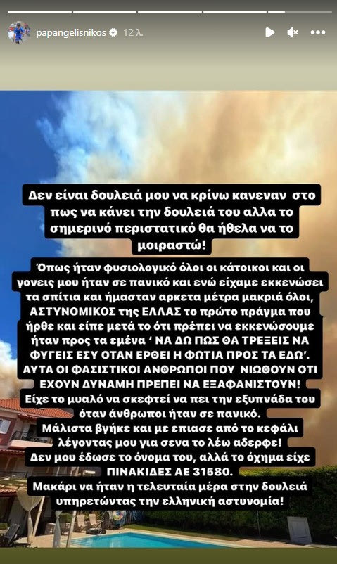 Ο Νίκος Παπαγγελής με ανάρτησή του κατήγγειλε αστυνομικό ο οποίος σύμφωνα με την καταγγελία του είπε: "Να δω πως θα τρέξεις να φύγεις όταν έρθει η φωτιά".