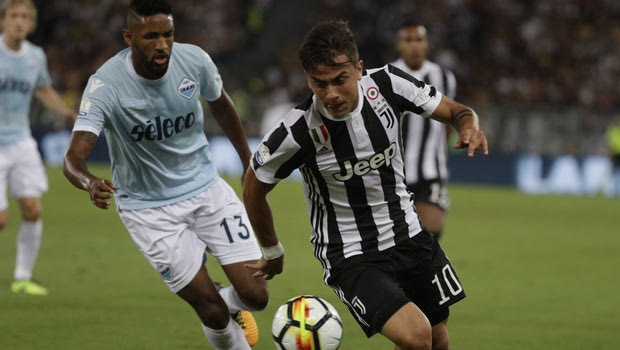 Juventus' Paulo Dybala , right, and Lazio's Fortuna Wallace vie for the ball during the Italian Super Cup final match between Lazio and Juventus at Rome's Olympic stadium, Sunday, Aug. 13, 2017. (AP Photo/Gregorio Borgia)