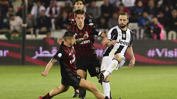 Juventus's Gonzalo Higuain, right, kicks the ball during the Italian Super Cup soccer match between Juventus and AC Milan, at the Al Sadd Sports Club in Doha, Qatar, Friday, Dec. 23, 2016. (AP Photo/Alexandra Panagiotidou)