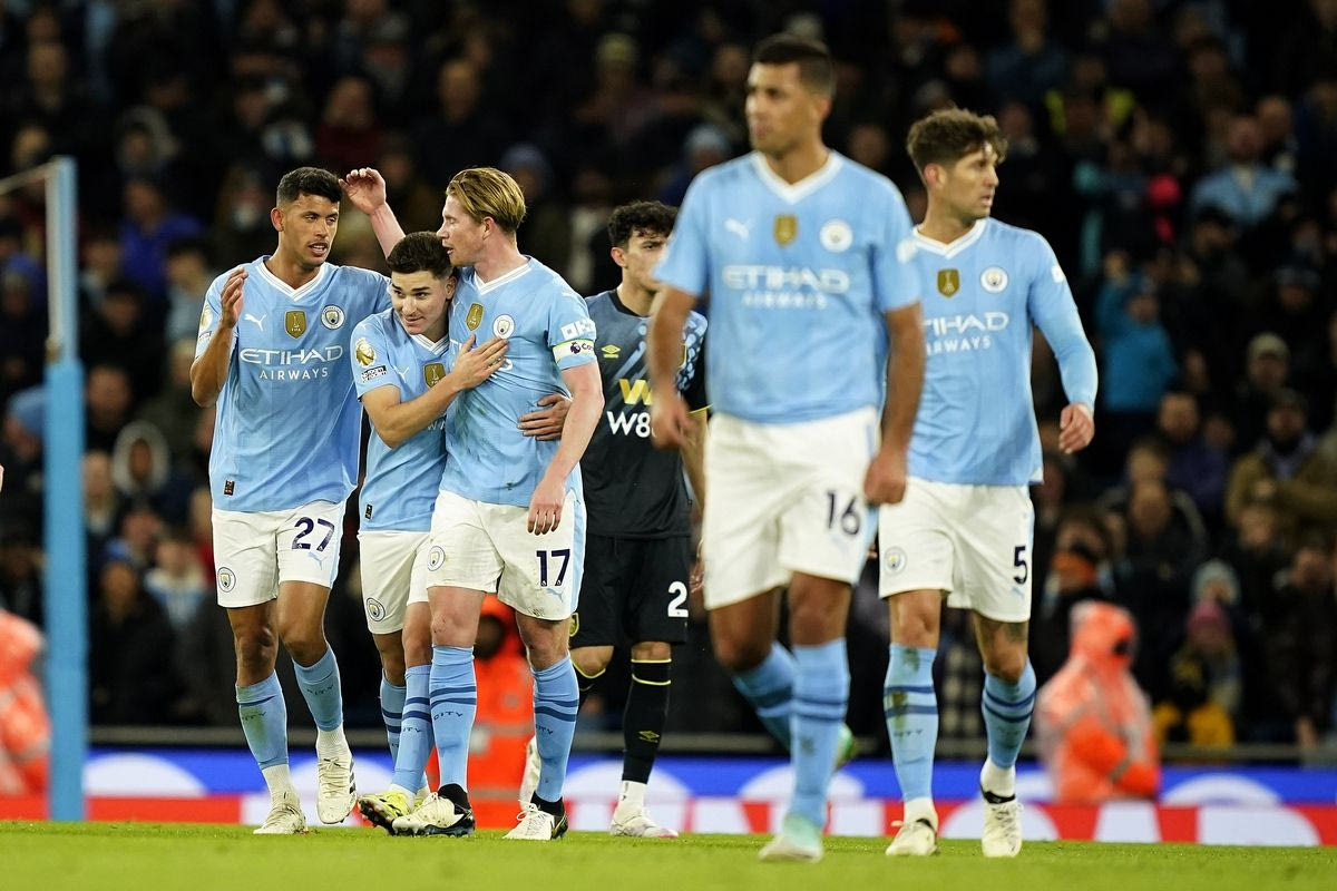 Οι παίκτες της Μάντσεστερ Σίτι πανηγυρίζουν γκολ που σημείωσαν κόντρα στην Μπέρνλι για την Premier League 2023-2024 στο "Ετιχάντ", Μάντσεστερ | Τετάρτη 31 Ιανουαρίου 2024