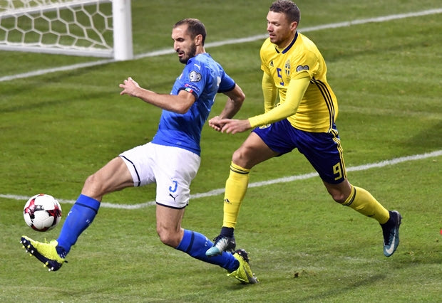 Italy's Giorgio Chiellini, left, and Sweden's Marcus Berg battle for the ball during the World Cup qualifying play-off first leg soccer match between Sweden and Italy, at the Friends Arena in Stockholm, Friday, Nov. 10, 2017. (Jonas Ekstromer/TT via AP)
