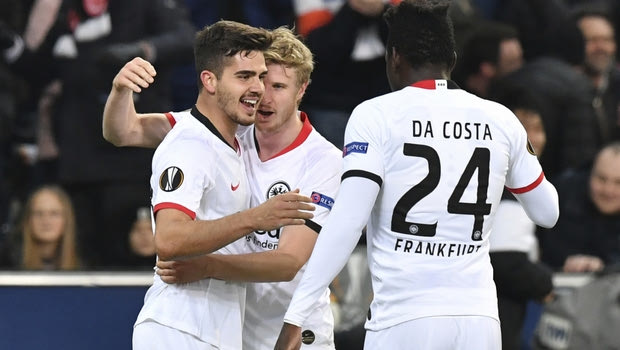 Frankfurt's Andre Silva, left, celebrates after scoring his side's second goal during the Europa League round of 32 second leg soccer match between FC Red Bull Salzburg and Eintracht Frankfurt at the Red Bull Arena in Salzburg, Austria, Friday, Feb. 28, 2020. (AP Photo/Kerstin Joensson)