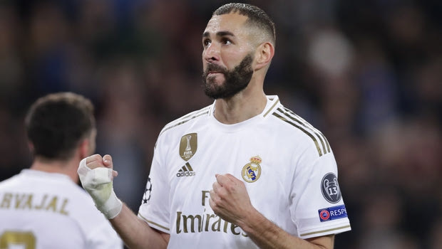 Real Madrid's Karim Benzema celebrates after scoring his side's fifth goal during a Champions League group A soccer match between Real Madrid and Galatasaray at the Santiago Bernabeu stadium in Madrid, Spain, Wednesday, Nov. 6, 2019. (AP Photo/Manu Fernandez)