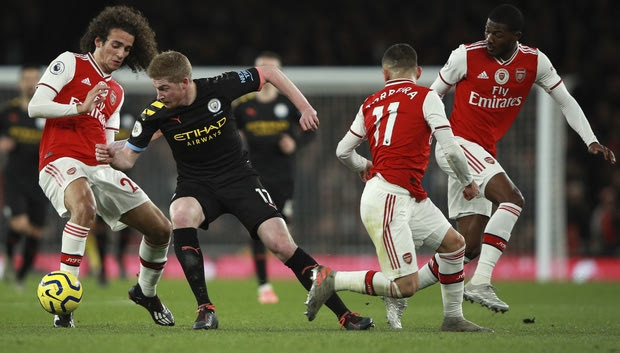 Manchester City's Kevin De Bruyne, second left, Arsenal's Matteo Guendouzi, left, Arsenal's Lucas Torreira, second right, and Arsenal's Ainsley Maitland-Niles during the English Premier League soccer match between Arsenal and Manchester City, at the Emirates Stadium in London, Sunday, Dec. 15, 2019. (AP Photo/Ian Walton)