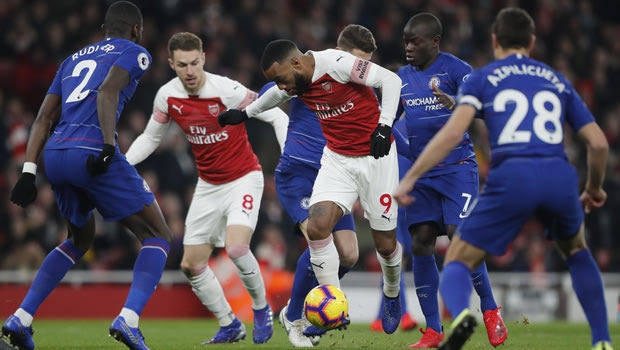 Arsenal's Alexandre Lacazette, centre, attempts to get through the Chelsea defence during the English Premier League soccer match between Arsenal and Chelsea at the Emirates stadium in London, Saturday, Jan. 19, 2019. (AP Photo/Frank Augstein)