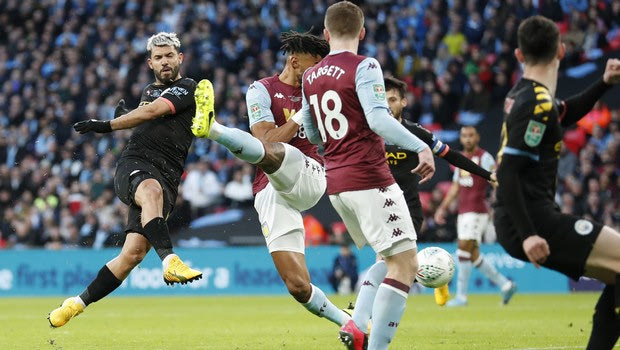 Manchester City's Sergio Aguero, left, scores his side's first goal during the League Cup soccer match final between Aston Villa and Manchester City, at Wembley stadium, in London, England, Sunday, March 1, 2020. (AP Photo/Alastair Grant)