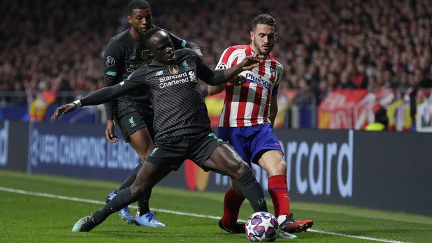 Atletico Madrid's Koke, right, and Liverpool's Sadio Mane fight for the ball during a 1st leg, round of 16, of the Champions League soccer match between Atletico Madrid and Liverpool at the Wanda Metropolitano stadium in Madrid, Tuesday, Feb. 18, 2020. (AP Photo/Manu Fernandez)