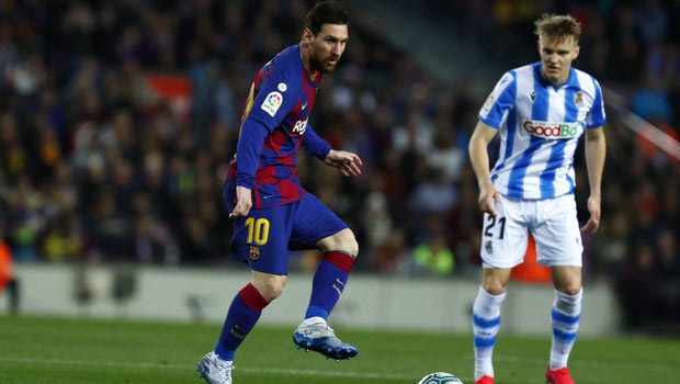 Barcelona's Lionel Messi, left, plays the ball past Real Sociedad's Martin Oedegaard during a Spanish La Liga soccer match between Barcelona and Real Sociedad at the Camp Nou stadium in Barcelona, Spain, Saturday, March 7, 2020. (AP Photo/Joan Monfort)