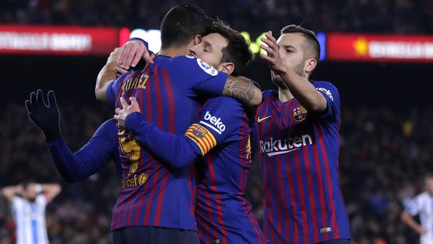 FC Barcelona's Luis Suarez celebrates with teammates during the Spanish La Liga soccer match between FC Barcelona and Leganes at the Camp Nou stadium in Barcelona, Spain, Sunday, Jan. 20, 2019. (AP Photo/Manu Fernandez)