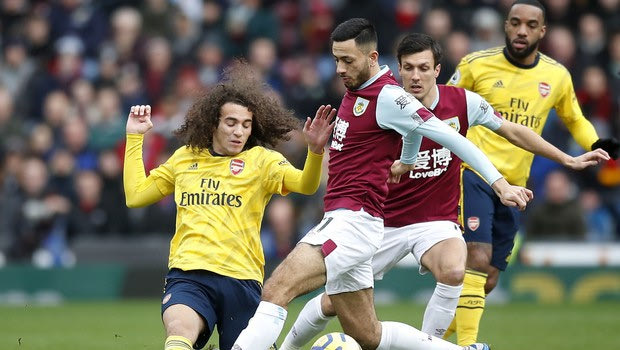 Arsenal's Matteo Guendouzi, left, and Burnley's Dwight McNeil battle for the ball during the English Premier League soccer match between Burnley and Arsenal at Turf Moor, Burnley, England, Sunday, Feb. 2, 2020. (Martin Rickett/PA via AP)