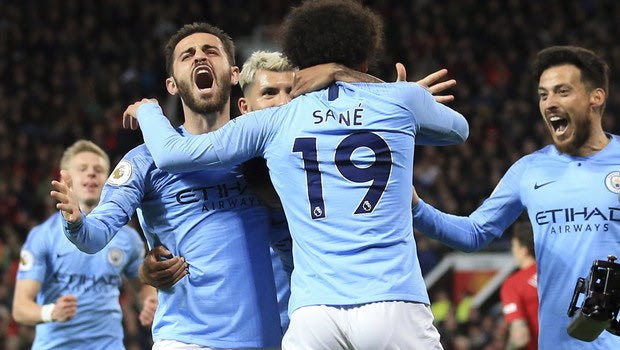 Manchester City's Leroy Sane, 2nd right, celebrates after scoring his side's second goal during the English Premier League soccer match between Manchester United and Manchester City at Old Trafford Stadium in Manchester, England, Wednesday April 24, 2019. (AP Photo/Jon Super)