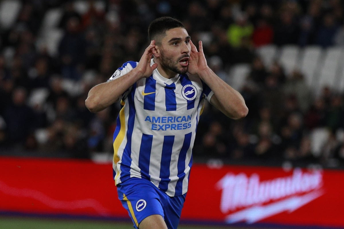 Brighton's Neal Maupay celebrates after scoring his side's opening goal during the English Premier League soccer match between West Ham United and Brighton and Hove Albion in London, England, Wednesday, Dec. 1, 2021. (AP Photo/Ian Walton)