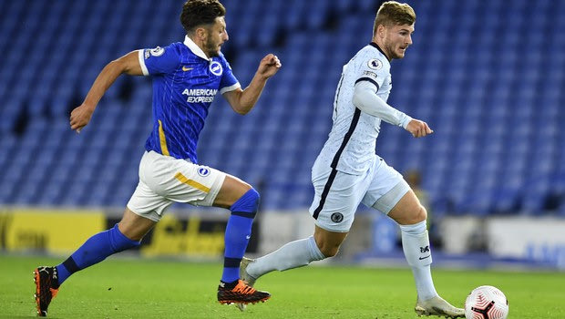 Chelsea's Timo Werner, right, takes the ball away from Brighton's Adam Lallana during the English Premier League soccer match between Brighton and Chelsea at Falmer Stadium in Brighton, England, Monday, Sept. 14, 2020. (Glynn Kirk/Pool via AP)