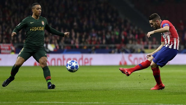 Atletico midfielder Koke, right, scores the opening goal of his team during a Group A Champions League soccer match between Atletico Madrid and Monaco at the Metropolitano stadium in Madrid, Wednesday, Nov. 28, 2018. (AP Photo/Manu Fernandez)