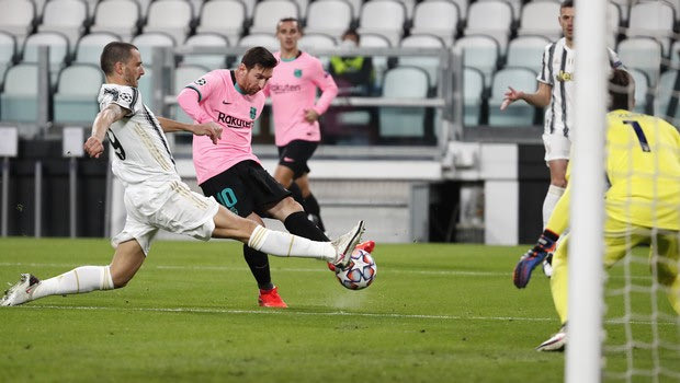 O Mέσι προσπαθεί να νικήσει τον Στσέσνι υπό την πίεση του Μπονούτσι σε ματς της Γιουβέντους με την Μπαρτσελόνα για το Champions League