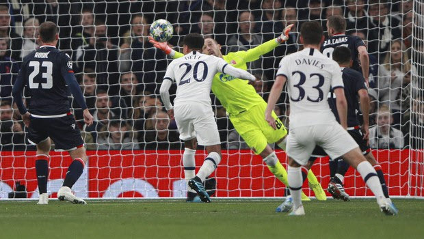 Red Star's goalkeeper Milan Borjan fails to save a shot by Tottenham's Harry Kane during the Champions League, group B, soccer match between Tottenham and Red Star Belgrade, at the Tottenham Hotspur stadium in London, Tuesday, Oct. 22, 2019. (AP Photo/Ian Walton)
