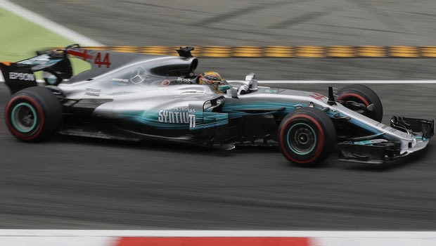 Mercedes driver Lewis Hamilton of Britain steers his car during the first free practice for Sunday's Italian Formula One Grand Prix, at the Monza racetrack, Italy, Friday, Sept.1, 2017. (AP Photo/Luca Bruno)