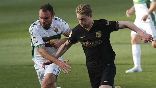 Ο Φρένκι Ντε Γιονγκ τρέχει με την μπάλα στην αναμέτρηση της Μπαρτσελόνα με την Έλτσε εκτός έδρας