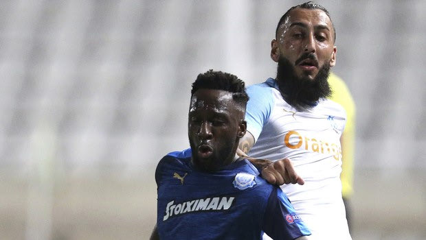 Apollon's Richard Soumah, left, fights for the ball with Marseille's Konstantinos Mitroglou during the Europa League group H soccer match between Apollon Limassol and Marseille at GSP stadium, in Nicosia, Cyprus, on Thursday, Oct. 4, 2018. (AP Photo/Petros Karadjias)
