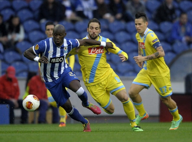 Porto's French defender Eliaquim Mangala (L) vies with Napoli's Argentinian forward Gonzalo Higuain (C) during the UEFA Europa League round of 16 first leg football match FC Porto vs SSC Napoli at the Dragao stadium in Porto on March 13, 2014. AFP PHOTO/ MIGUEL RIOPA (Photo credit should read MIGUEL RIOPA/AFP/Getty Images)