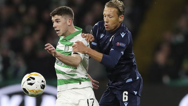 Celtic's Ryan Christie, left, challenges for the ball with Lazio's Lucas Leiva during the Europa League group E soccer match between Celtic and Lazio at Celtic Park stadium in Glasgow, Scotland, Thursday, Oct. 24, 2019. (AP Photo/Scott Heppell)