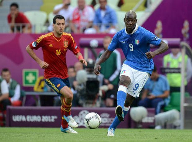 Italy's Mario Balotelli (right) in action with Spain's Sergio Busquets
