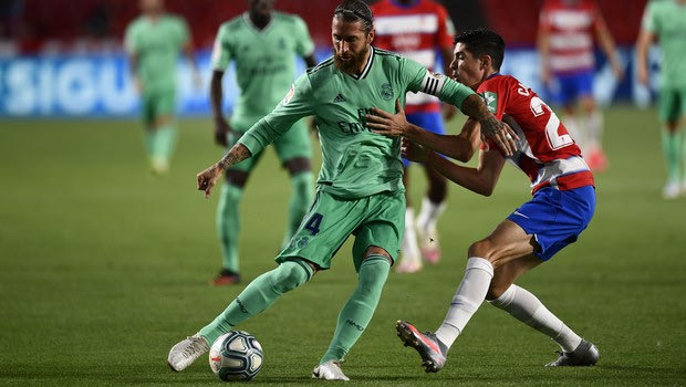 Real Madrid's Sergio Ramos, left, vies for the ball with Granada's Carlos Fernandez during the Spanish La Liga soccer match between Granada and Real Madrid at the Los Carmenes stadium in Granada, Spain, Monday, July 13, 2020. (AP Photo/Jose Breton)