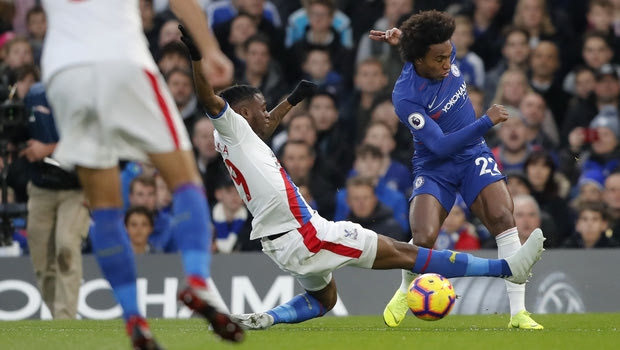 Chelsea's William, right, vies for the ball with Crystal Palace's Aaron Wan-Bissaka during the English Premier League soccer match between Chelsea and Crystal Palace at Stamford Bridge stadium in London, Sunday, Nov. 4, 2018. (AP Photo/Frank Augstein)