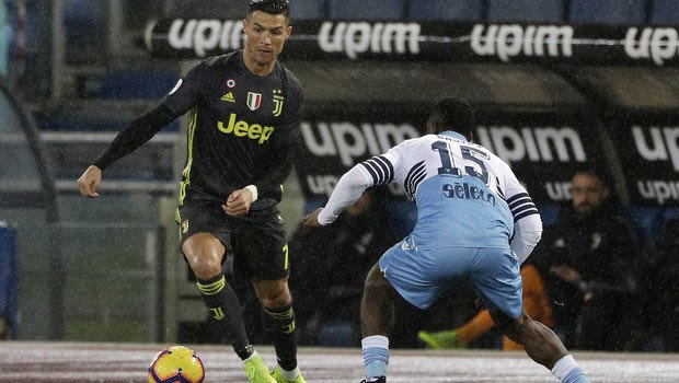 Juventus' Cristiano Ronaldo, left, tries to dribble past Lazio's Quissanga Bastos during the Serie A soccer match between Lazio and Juventus at the Olympic stadium, in Rome, Sunday, Jan. 27, 2019. (AP Photo/Gregorio Borgia)