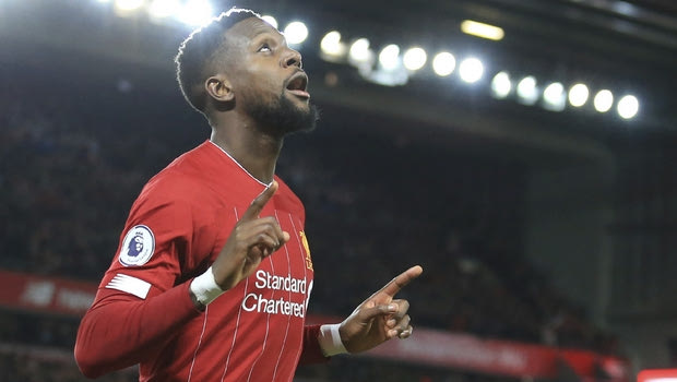Liverpool's Divock Origi celebrates his goal against Everton during the English Premier League soccer match between Liverpool and Everton at Anfield Stadium, Liverpool, England, Wednesday, Dec. 4, 2019. (AP Photo/Jon Super)