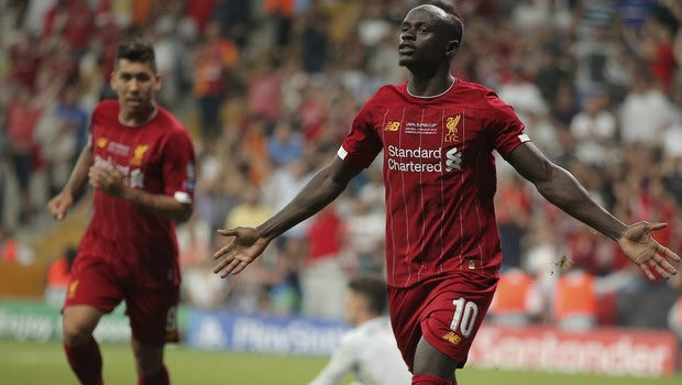 Liverpool's Sadio Mane celebrates after scoring his side's opening goal during the UEFA Super Cup soccer match between Liverpool and Chelsea, in Besiktas Park, in Istanbul, Wednesday, Aug. 14, 2019. (AP Photo)