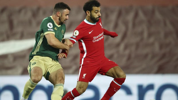 Διεκδίκηση της μπάλας από τους Σαλάχ και Στίβενς σε ματς της Λίβερπουλ με την Σέφιλντ Γιουνάιτεντ στο Άνφιλντ