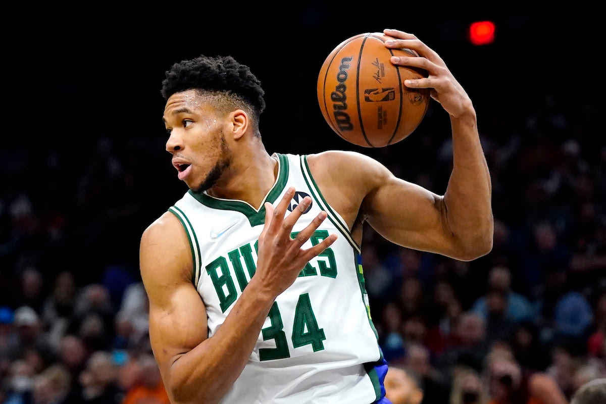 Milwaukee Bucks forward Giannis Antetokounmpo grabs a rebound against the Phoenix Suns during the first half of an NBA basketball game Thursday, Feb. 10, 2022, in Phoenix. (AP Photo/Ross D. Franklin)