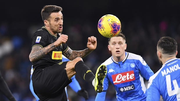 Inter's Matias Vecino, left, and Napoli's Konstantinos Manolas, right, in action during the Serie A soccer match between Napoli and Inter Milan at the San Paolo stadium Naples, Italy, Monday Jan. 6, 2020. (Cafaro/LaPresse via AP)
