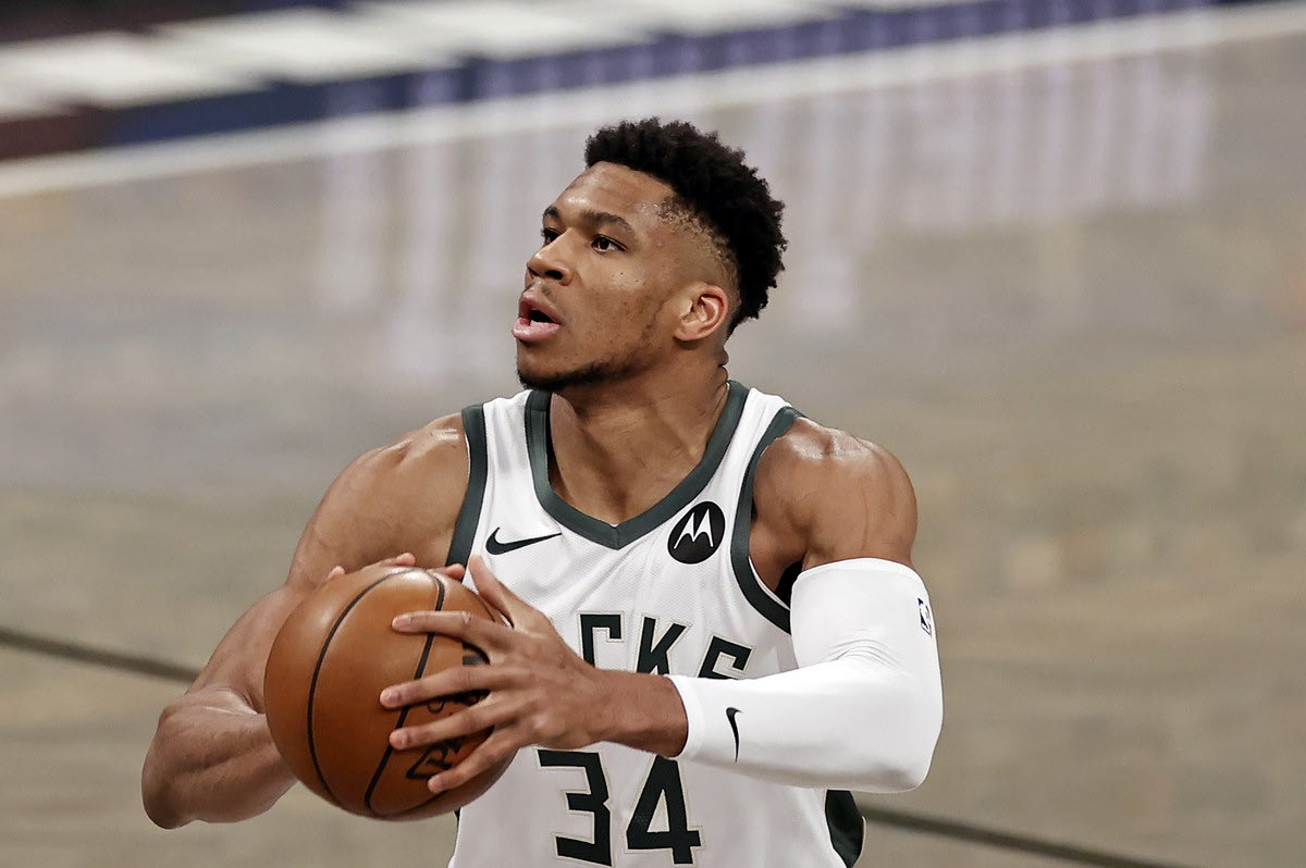 Ο Γιάννης Αντετοκούνμπο εκτελεί βολή στο Game 1 της ημιτελικής σειράς της Ανατολής ανάμεσα στους Νετς και στους Μπακς