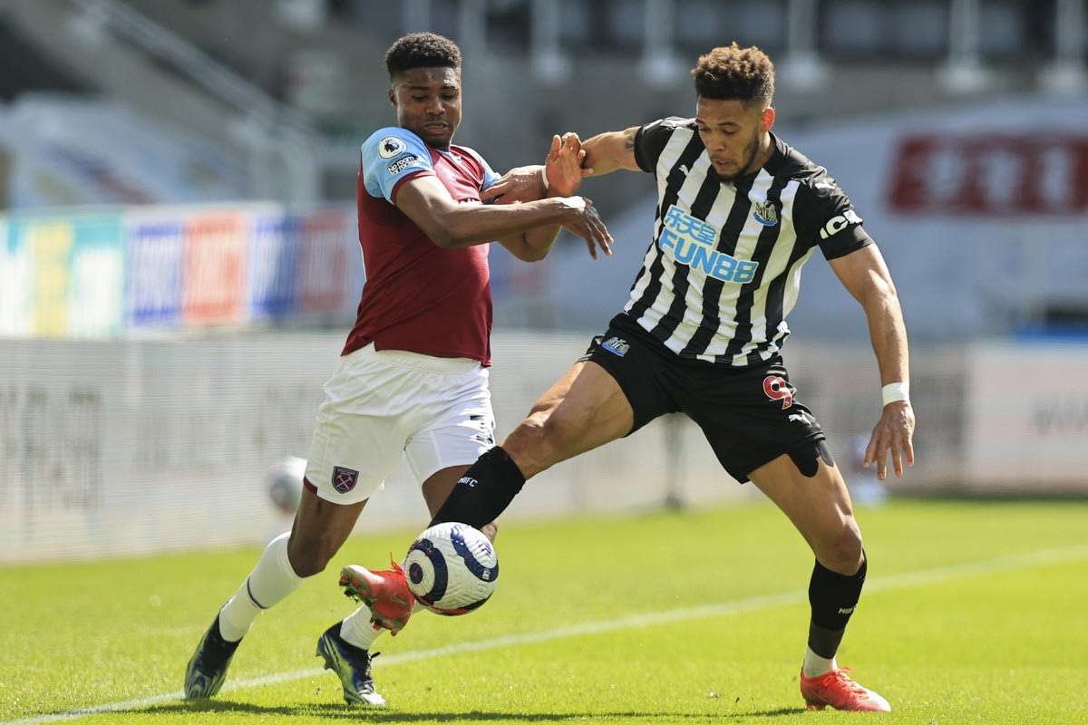 Ο Ζοέλιντον της Νιούκαστλ σε μονομαχία με τον Μπεν Τζόνσον της Γουέστ Χαμ για την Premier League 2020-2021 στο "Σεντ Τζέιμς Παρκ", Νιούκαστλ | Σάββατο 17 Απριλίου 2021