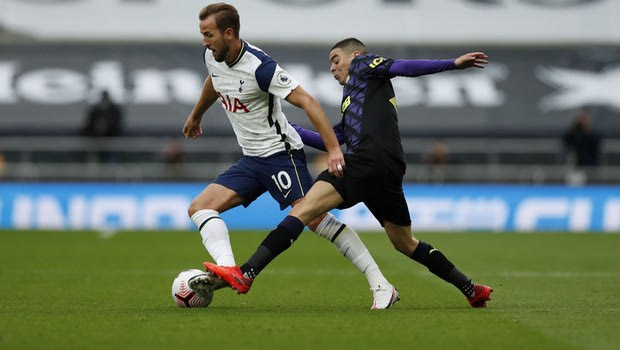 Tottenham's Harry Kane, left, and Newcastle's Miguel Almiron vie for the ball during the English Premier League soccer match between Tottenham and Newcastle at the Tottenham Hotspur Stadium in London, Sunday, Sept. 27, 2020. (Andrew Boyers/Pool via AP)