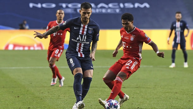 PSG's Leandro Paredes and Bayern's Serge Gnabry, right, challenge for the ball during the Champions League final soccer match between Paris Saint-Germain and Bayern Munich at the Luz stadium in Lisbon, Portugal, Sunday, Aug. 23, 2020. (David Ramos/Pool via AP)
