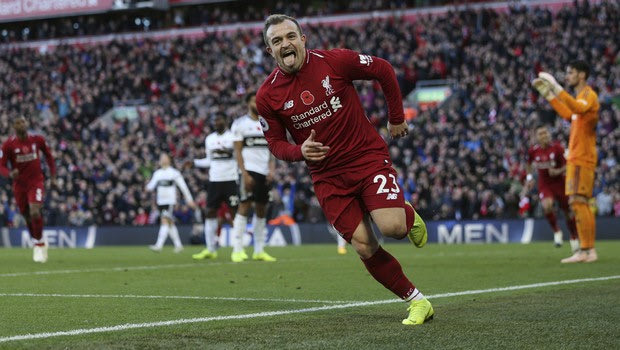 Liverpool's Xherdan Shaqiri celebrates scoring his side's second goal of the game, during the English Premier League soccer match between Liverpool and Fulham, at Anfield Stadium, in Liverpool, England, Sunday, Nov. 11, 2018. (Barrington Coombs/PA via AP)