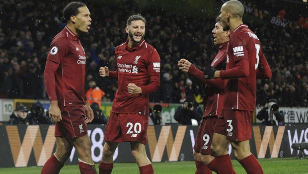 Liverpool's Virgil van Dijk, right, celebrates with team mates after scoring his side's second goal during the English Premier League soccer match between Wolverhampton Wanderers and Liverpool at the Molineux Stadium in Wolverhampton, England, Friday, Dec. 21, 2018. (AP Photo/Rui Vieira)