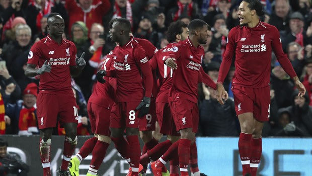 Liverpool forward Sadio Mane, left, celebrates with his teammate Naby Keita after scoring the opening goal during the English Premier League soccer match between Liverpool and Leicester City, at Anfield Stadium, Liverpool, England, Wednesday, Jan.29, 2019. (AP Photo/Jon Super)