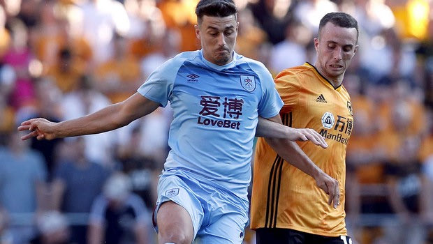 Wolverhampton Wanderers's Diogo Jota, right, and Burnley's Matthew Lowton battle for the ball during the English Premier League soccer match Between Burnley and Wolverhampton Wanderers at Molineux, Wolverhampton, England, Sunday Aug. 25, 2019. (Darren Staples/PA via AP)