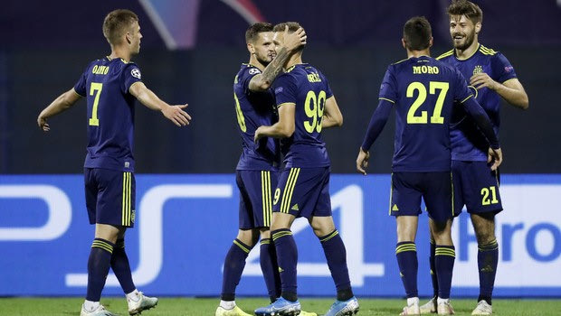 Dinamo Zagreb players celebrated a goal against Atalanta during the group C Champions League soccer match between Dinamo Zagreb and Atalanta at the Maksimir Stadium in Zagreb, Croatia, Wednesday, Sept. 18, 2019. (AP Photo/Darko Bandic)