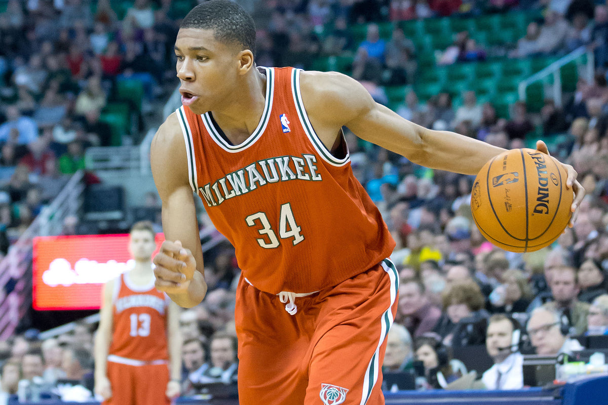 Jan 2, 2014; Salt Lake City, UT, USA; Milwaukee Bucks shooting guard Giannis Antetokounmpo (34) dribbles during the first half against the Utah Jazz at EnergySolutions Arena. Mandatory Credit: Russ Isabella-USA TODAY Sports