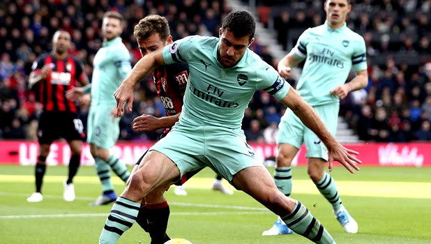 Arsenal's Sokratis Papastathopoulos shields the ball during their match against Bournemouth, during the English Premier League soccer match at The Vitality Stadium in Bournemouth, England, Sunday Nov. 25, 2018. (John Walton/PA via AP)