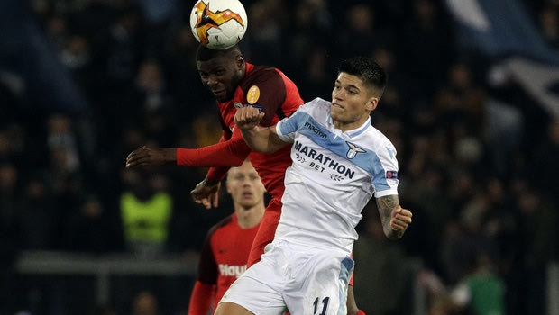 Sevilla's Ibrahim Amadou, left, jumps for a header with Lazio's Joaquin Correa during the Europa League Round of 32 first leg soccer match between Lazio and Sevilla at Rome's Olympic Stadium, Thursday, Feb. 14, 2019. (AP Photo/Gregorio Borgia)