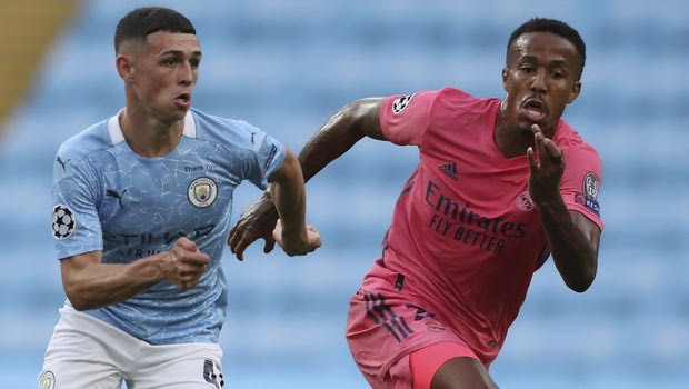 Manchester City's Phil Foden, left, runs with the ball during the Champions League round of 16, second leg soccer match between Manchester City and Real Madrid at the Etihad Stadium in Manchester, England, Friday, Aug. 7, 2020. (Nick Potts/Pool Photo via AP)