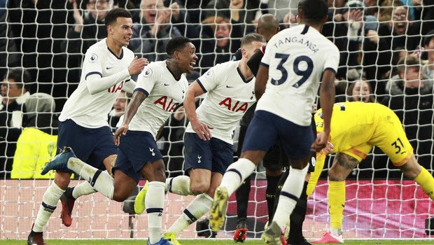 Tottenham's Steven Bergwijn, 2nd left, celebrates after scoring the opening goal during the English Premier League soccer match between Tottenham Hotspur and Manchester City at the Tottenham Hotspur Stadium in London, England, Sunday, Feb. 2, 2020. (AP Photo/Ian Walton)